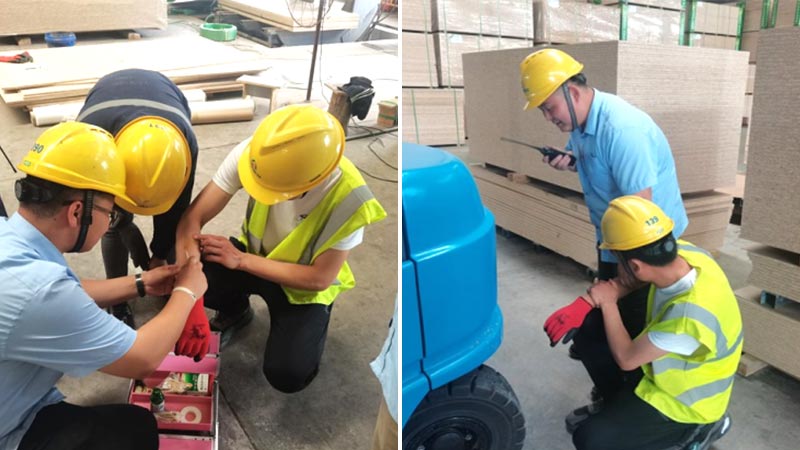 演(yan)練(lian)模(mo)擬(ni)場(chang)景(jing)為(wei)叉(cha)車(che)駕(jia)駛(shi)員(yuan)在(zai)倒(dao)車(che)時(shi),未(wei)及(ji)時(shi)觀(guan)察(cha)周(zhou)圍(wei)情(qing)況(kuang),碰(peng)到(dao)打(da)包(bao)員(yuan)工(gong),致(zhi)使(shi)員(yuan)工(gong)手(shou)臂(bi)與(yu)板(ban)材(cai)摩(mo)擦(ca)發(fa)生(sheng)破(po)皮(pi)傷(shang)。事(shi)故(gu)發(fa)生(sheng)後(hou),駕(jia)駛(shi)員(yuan)立(li)即(ji)將(jiang)車(che)輛(liang)熄(xi)火(huo)並(bing)拉(la)緊(jin)手(shou)刹(sha)下(xia)車(che)查(zha)看(kan)傷(shang)者(zhe)情(qing)況(kuang)並(bing)立(li)即(ji)向(xiang)部(bu)門(men)負(fu)責(ze)人(ren)報(bao)告(gao),部(bu)門(men)負(fu)責(ze)人(ren)在(zai)接(jie)到(dao)報(bao)告(gao)後(hou)迅(xun)速(su)趕(gan)往(wang)事(shi)故(gu)現(xian)場(chang)並(bing)啟(qi)動(dong)車(che)輛(liang)傷(shang)害(hai)事(shi)故(gu)現(xian)場(chang)處(chu)置(zhi)方(fang)案(an),各(ge)應(ying)急(ji)救(jiu)援(yuan)小(xiao)組(zu)迅(xun)速(su)響(xiang)應(ying)、各司其職、沉著冷靜、按照流程進行處置,參演人員聽從指揮、服從命令,經處置後,車輛傷害現場處置方案演練順利完成,演練達到了預期效果。